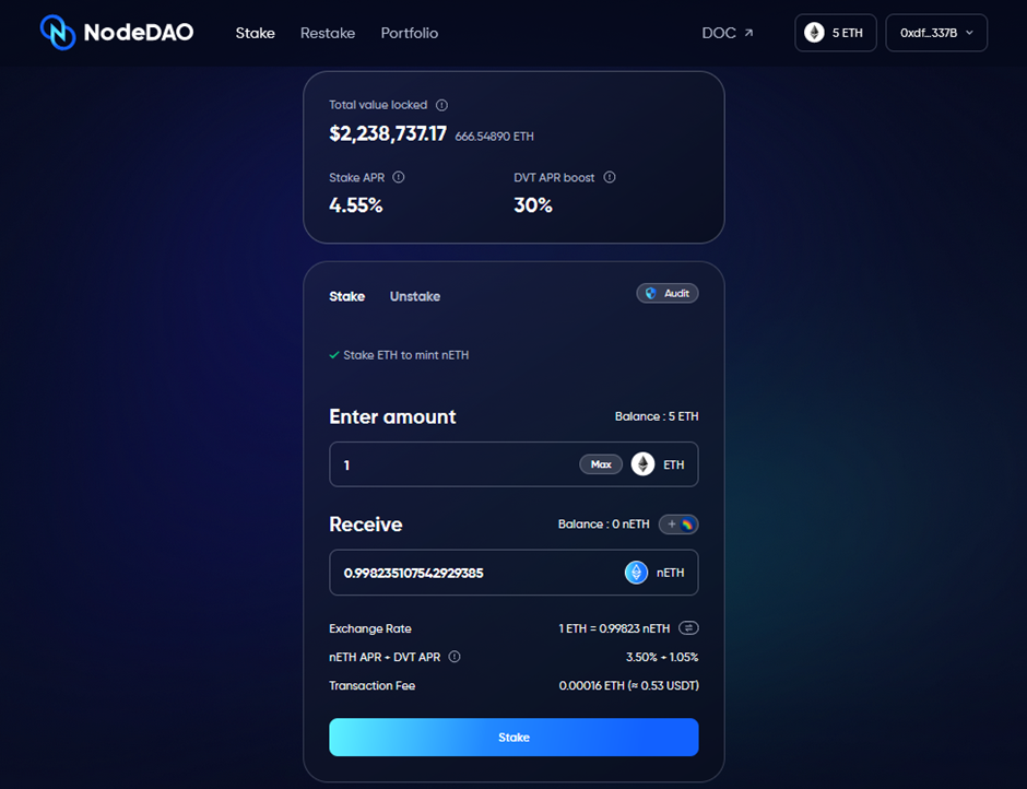 欢迎使用我们的 NodeDAO 协议，您可以在其中通过抵押 ETH 获得奖励，只需 0.000001 ETH，您就可以存入和接收 nETH 流动性抵押代币。 与其他变基代币不同，nETH 不会变基，您钱包中的代币数量将保持不变。