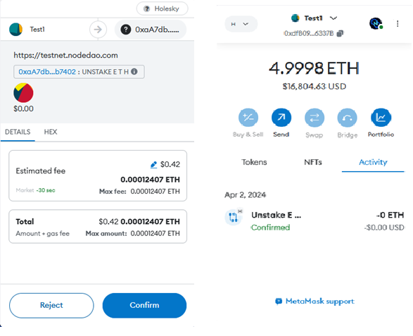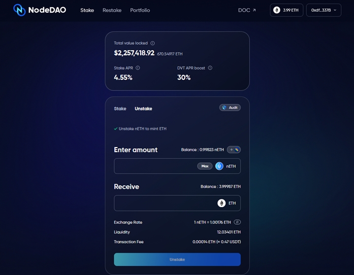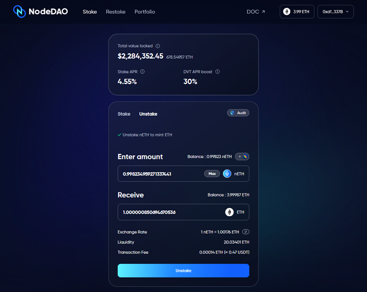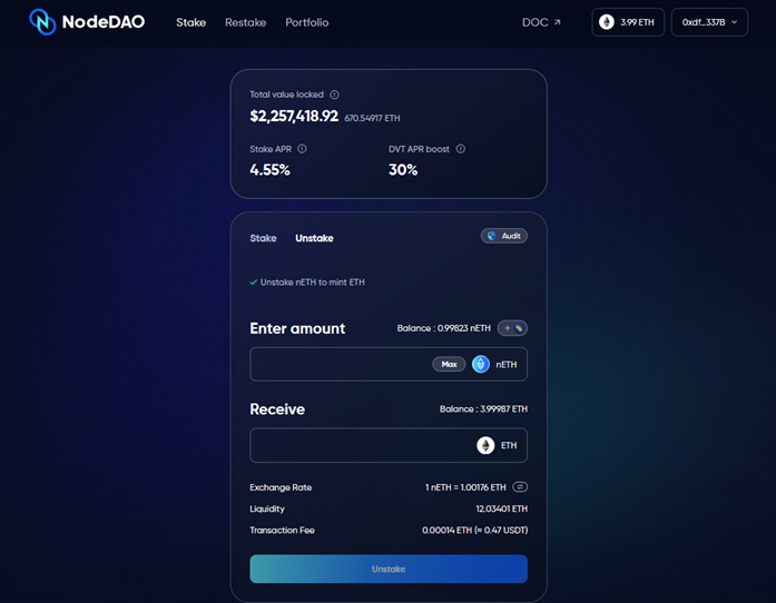 Select the "Unstake" tab, choose the option to withdraw nETH, and specify the desired amount. Remember that you will not be able to exchange or unstake nETH unless you have previously staked ETH through the NodeDAO platform.